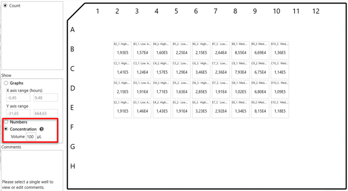専用プログラムにより、ウェル内の胞子を特定してカウントできます(上:96ウェルプレートの例)。カウント結果は、実際の数または濃度(オブジェクト/ml)で表示されます(上の例の赤い四角を参照)。正確にカウントするには、ウェル内で細胞が均等に分布していることが重要です。分布は、ピペット操作や培地とプラスチックの温度差など、いくつかの要因によって影響を受けます。カウントを行う際には、より良い統計データを得るために広いスキャンエリア(例:80画像=3.6mm)を設定することをお勧めします。
