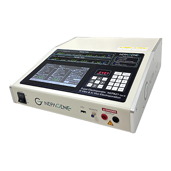 - 2-Step DC (Direct Current) Pulses with Voltage Decay: Pores form in the aligned cells membranes are high-efficiency by 2-Step DC Pulses with Voltage Decay (Multiple pulses・Decay rate・Polarity exchanged).
