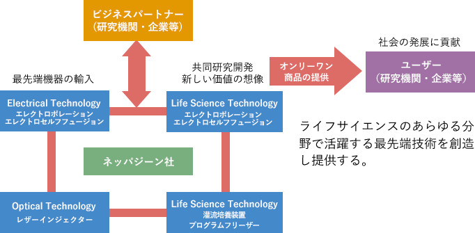 ネッパジーン社は、エレクトロポレーション(電気パルス利用遺伝子導入)・エレクトロセルフュージョン(電気パルス利用細胞融合)・ソノポレーション(超音波利用遺伝子導入)と3分野の装置のトップメーカーです。 日本国内や世界各国の大学・研究所・病院・企業で当社製品は数多く使用され、ライフサイエンス最先端の研究に広く貢献しています。 常に研究者に密着した営業活動を行い、最新の製品・技術及び情報を提供し、迅速なメンテナンス体制で対応致します。 当社は、3分野以外もたえず新しい技術・製品の開発に努めており、新しい価値を創造して、ライフサイエンスの進歩・発展に貢献したいと願っています。